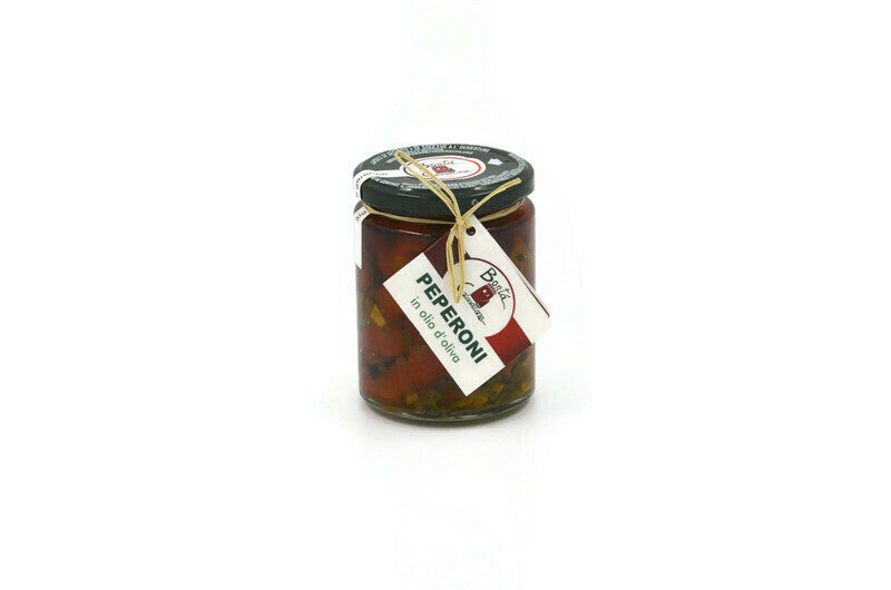 Peperoni in olio d'oliva. Ingredienti:Peperoni,olio extra vergine d'oliva,aceto di vino,prezzemolo,pepe,aglio,sale.